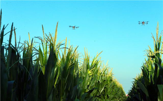 陽光燦爛,晴空萬里。一望無際的玉米抽穗揚花,十余架植保無人機盤旋作業。站在田邊的高臺上眺望,希望的田野上生機無限。 |