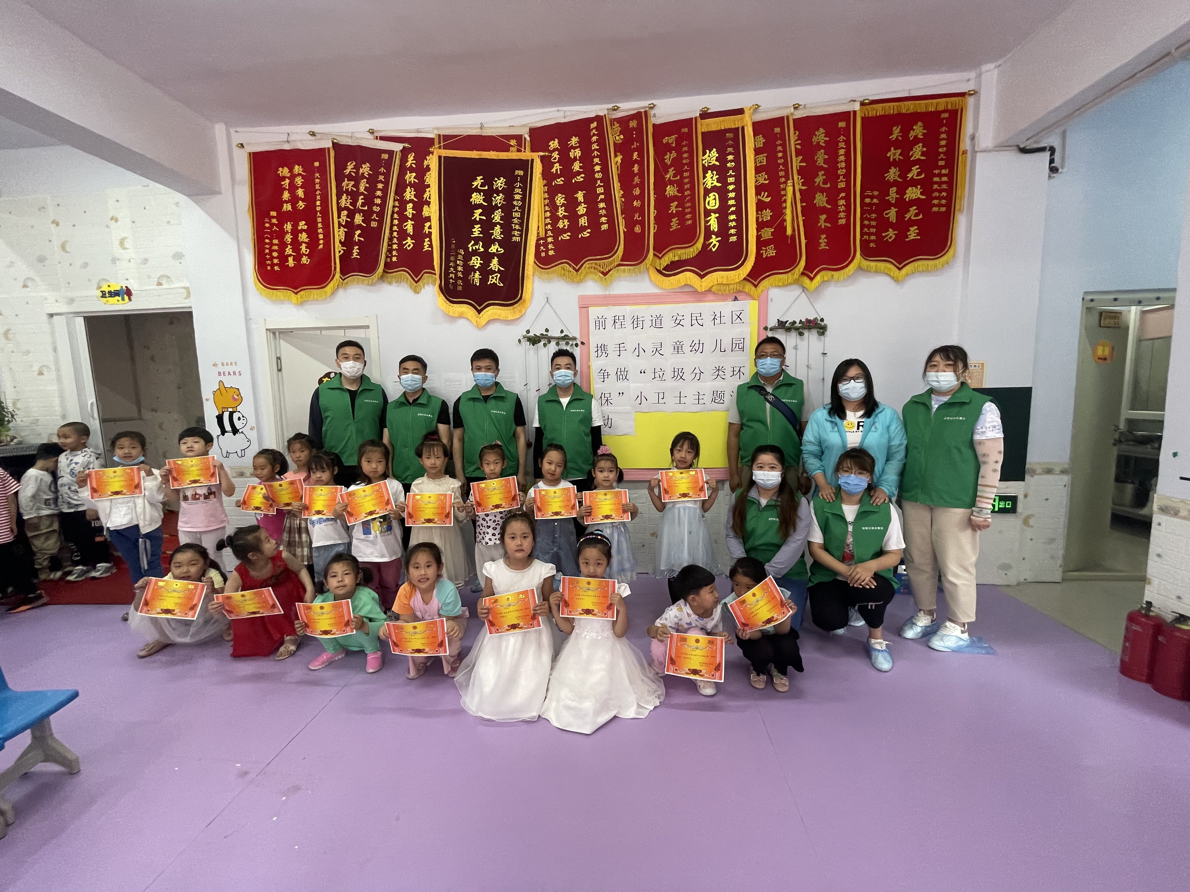 活動最后,吉報集團志愿者服務(wù)隊與安民社區(qū)工作人員為幼兒園的小朋友們發(fā)放了“垃圾分類環(huán)保小衛(wèi)士”證書。