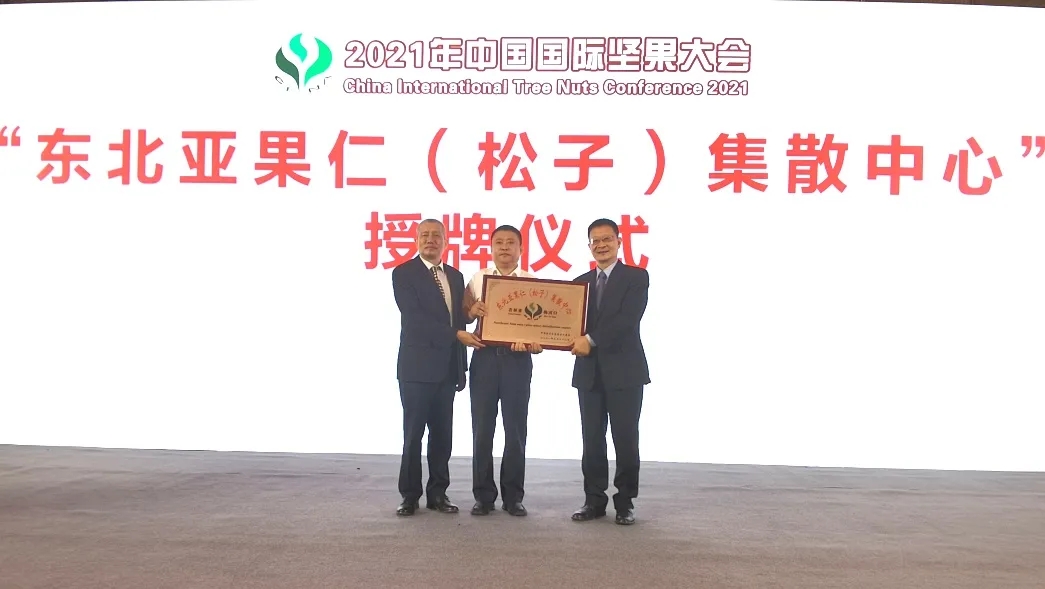 近日,2021中國國際堅果大會在浙江省杭州市舉行,會上,國家商務(wù)部駐杭州特派員辦事處副特派員周關(guān)超、中國食品土畜進出口商會會長曹德榮向梅河口市商務(wù)局局長王陳雷頒發(fā)了“東北亞果仁(松子)集散中心”牌匾,這標志著梅河口市又增加了一張亮眼的“產(chǎn)業(yè)名片”。