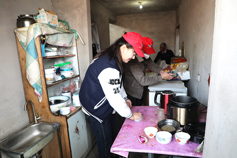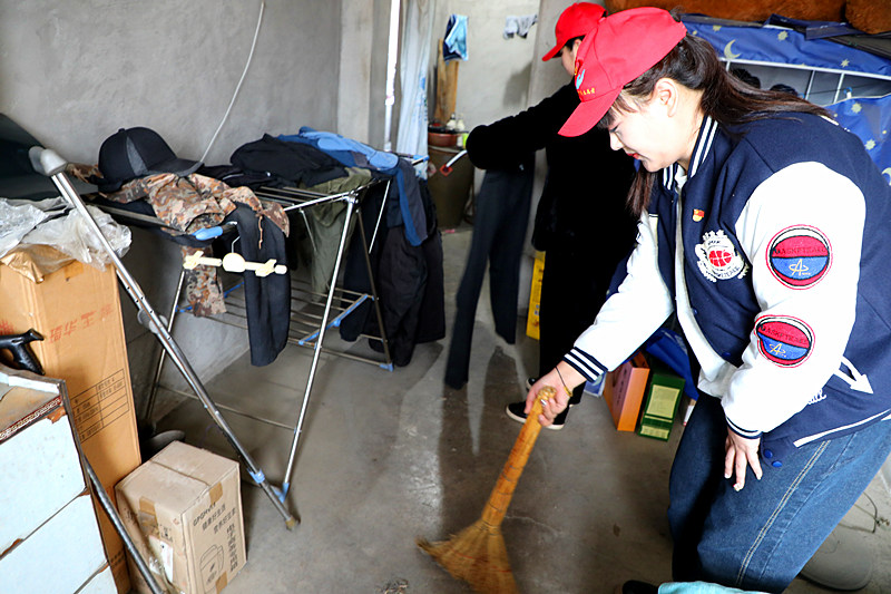 隨后,志愿服務隊員又為行動不便的老人清掃地面、整理衣物、擦桌柜等家務活,大家不嫌贓、不嫌累,干完這樣兒忙那樣兒,隊員們頭頂上繡有“共產黨員志愿者”小紅帽子象一盞盞小紅星在孤殘老人四十多平的屋子里顯得格外耀眼和醒目。