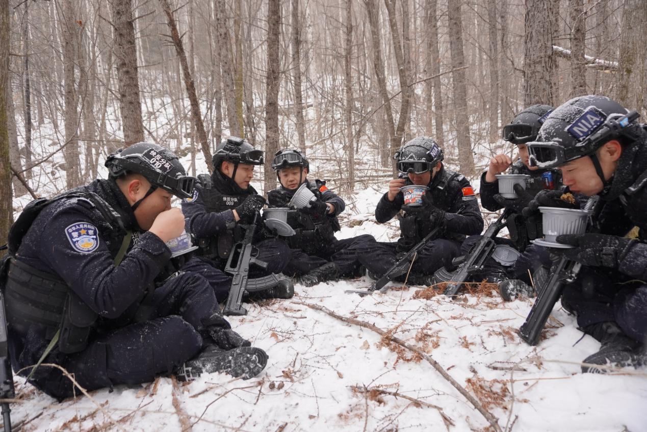 “這是狍子的腳印。”朱效賢上前查看說道。戍邊近20年,對于這里的一草一木他早已了如指掌。但為了慎重起見,朱效賢依舊讓民警放飛無人機從空中對周圍區(qū)域進行了細致搜尋。 下午2時許,巡邏隊伍在臨時駐勤點稍作休整。大家圍坐在一起,一邊吃著自熱米飯,一邊分享著巡邏中的所見所聞。短暫休息后,大家抖擻精神,再次奔赴巡邏路。
