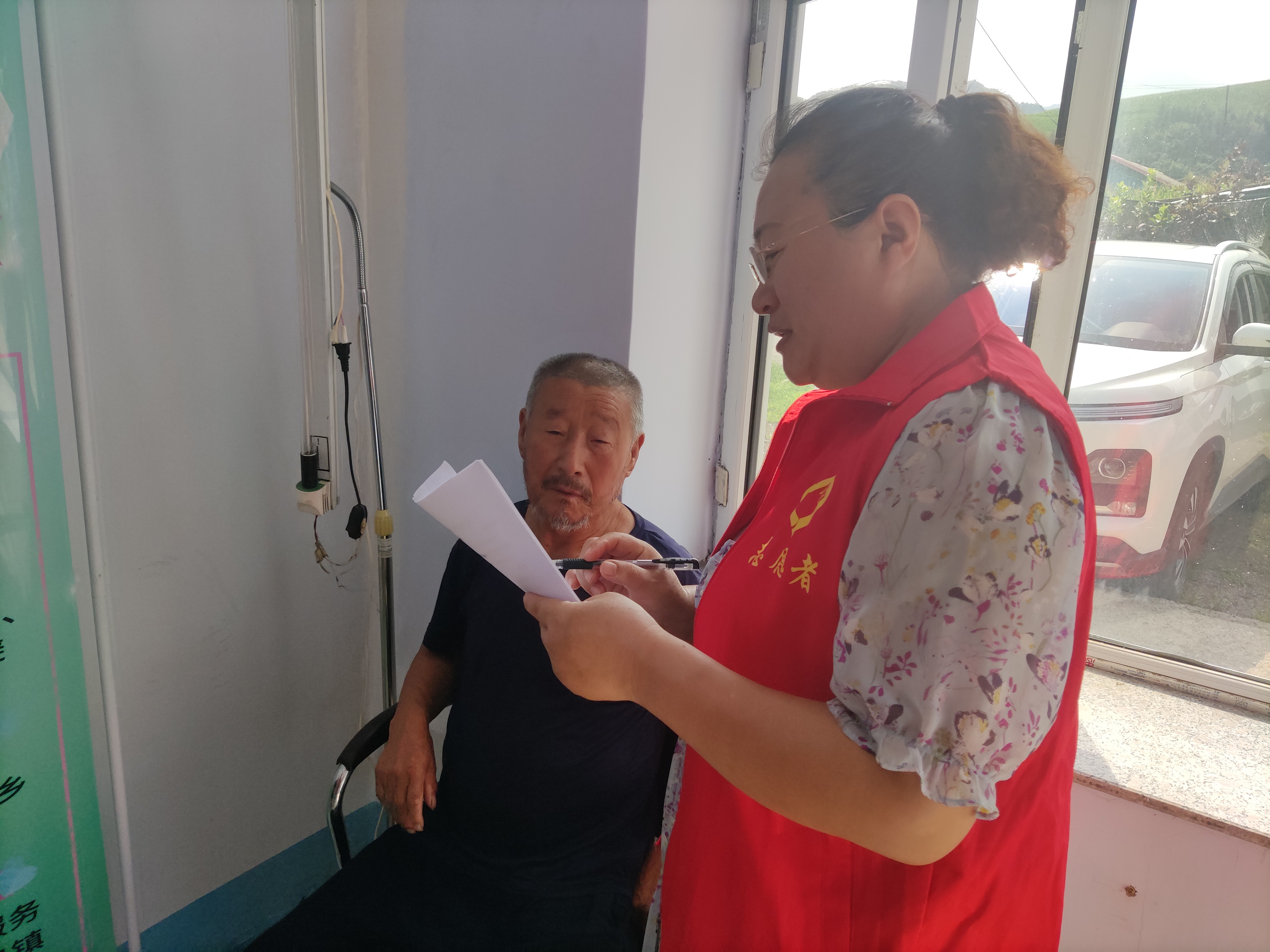活動現場,醫療志愿服務團隊在腰甸子村衛生室,熱情周到的接待每一名當地群眾,黨員醫務工作者主動作為、率先垂范,為大家認真開展測量血壓、檢測血糖、心肺聽診、心電B超等體格檢查,醫療專家根據問診情況和檢查結果,采用中西醫結合的有效方式,為就診患者辨證施治,并結合居民健康檔案信息,對慢性病患者調整治療方案,指導用藥,提出健康調理意見。醫護志愿者還耐心解答村民提出的健康問題,積極科普夏日調理健康知識,倡導積極健康的生活方式,傳授解暑養生小妙招,得到了現場群眾的一致好評。同時,醫療團隊派出小分隊入戶上門,來到行動不便的村民家中,開展針對性醫療幫扶,將優質的健康服務送到他們的炕頭上、心窩里。
