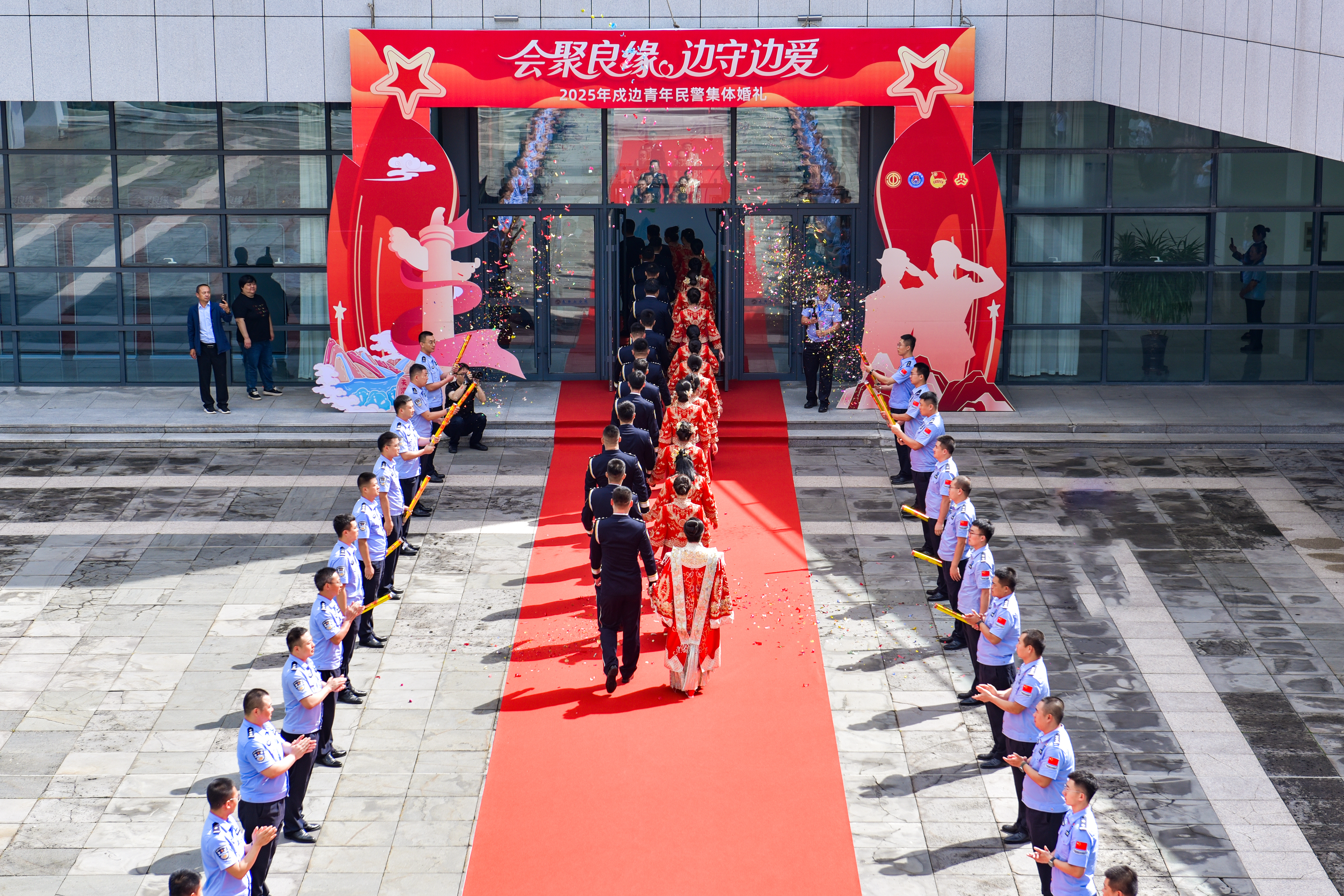 為讓這場婚禮既有浪漫溫度,更有使命厚度,吉林邊檢總站精心策劃了“參觀共鑄民族魂”“熱地打卡留光影”“愛灑邊關巡邏路”等多項主題活動。新人首先走進吉林省委黨校長白山分校東北抗聯黨性教育事跡館,感受革命先烈以前赴后繼赴國難,以血肉之軀筑長城的英雄事跡,讓愛情在紅色洗禮中更顯堅定;隨后打卡長白山風光美景,在爛漫花海與挺拔美人松下,用鏡頭定格甜蜜瞬間;最后踏上邊關巡邏路,這條他們守護的邊境線,此刻因愛人的陪伴更添溫情,兩人手牽手丈量土地的身影,將“家國”與“愛戀”交融成最鮮活的畫卷。 婚禮慶典當日,長白山下紅毯鋪就,18對新人身著筆挺的警禮服與喜慶的紅秀禾,在嘉賓與觀眾的掌聲中緩緩步入舞臺。他們互贈的定情信物里,有刻著界標編號的鋼筆,有繡著警徽的荷包——這些帶著“邊關印記”的禮物,藏著“你守國、我守你”的默契。“警徽為證!戰友為媒!我們定當風雨同舟,白首相攜,永結同心,此生不渝!”新人集體宣誓時,警徽格外閃耀,誓言里既有對愛情的承諾,更有對使命的堅守。最終,新人在幸福的氛圍和滿載的祝福中圓滿禮成。