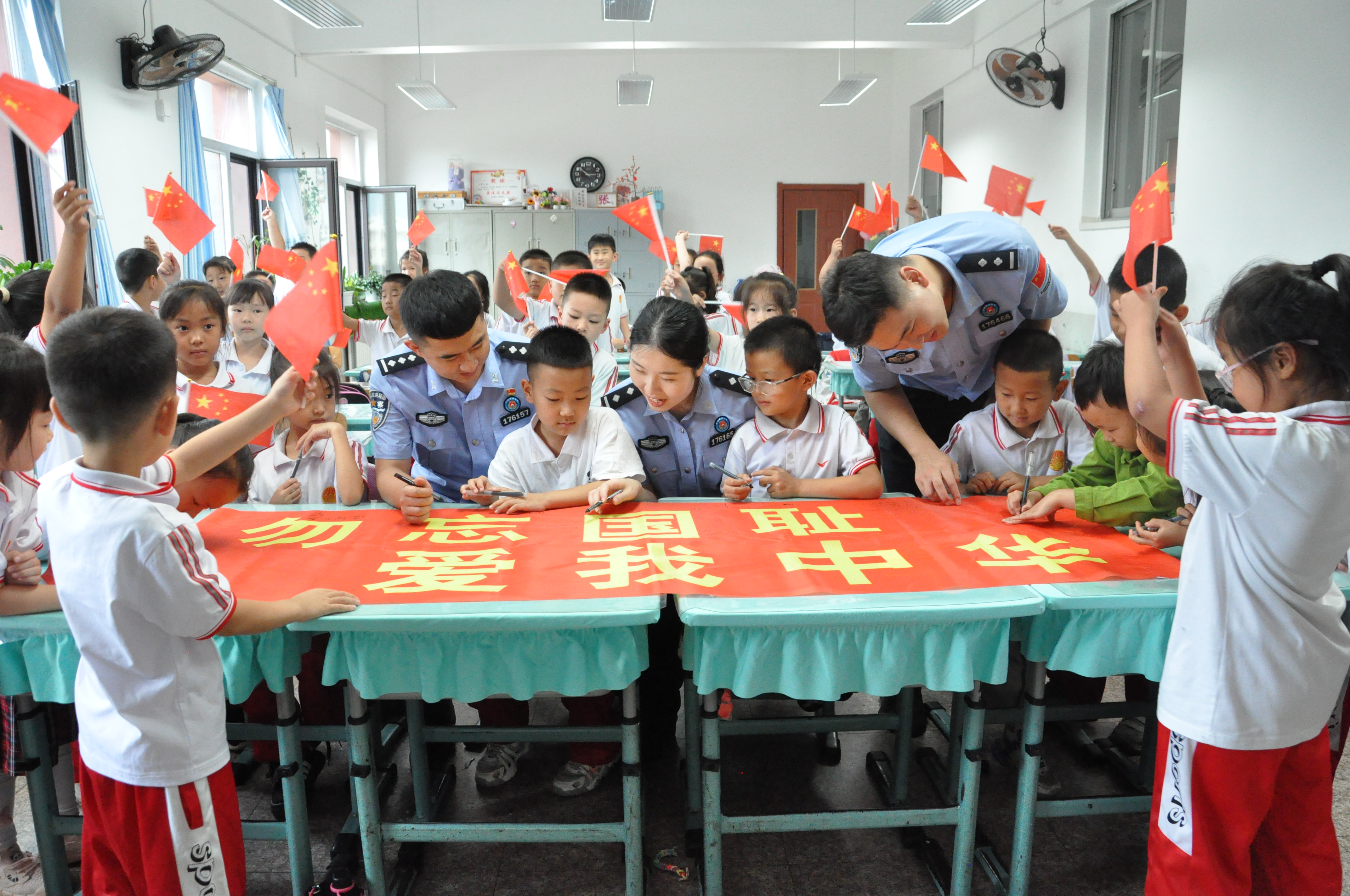 “如果回到1931年,你們愿意像小英雄雨來一樣,為保護鄉親們站出來嗎?”“我愿意!”孩子們高高舉起的小手如林?!熬彀⒁?,我要好好學習,長大也要當警察,保衛祖國!”8歲的孫墨桐攥著拳頭說。課后,民警與師生共同在“勿忘國恥·愛我中華”橫幅上簽名,稚嫩的筆跡與鮮紅的標語交相輝映,種下一顆顆愛國的種子。