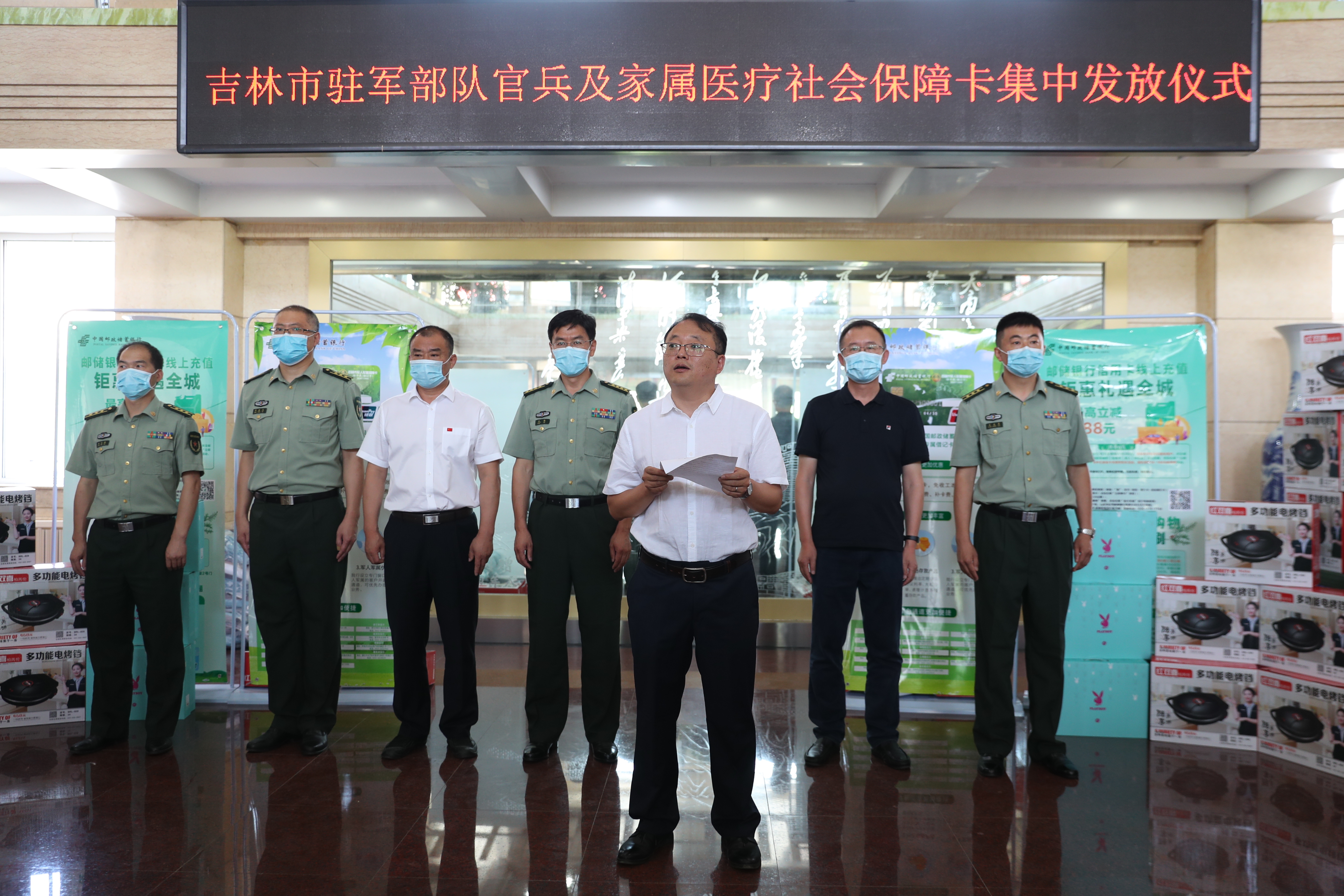 7月17日,吉林市駐軍部隊官兵及家屬醫療社會保障卡發放啟動儀式在吉林軍分區舉行,郵儲銀行吉林市分行作為唯一進駐銀行,現場為現役軍人及軍屬辦理軍人軍屬保障卡。吉林市分行劉學副行長、個人金融部總經理高楊、副總經理王慧吉同吉林軍分區、軍人事務局相關領導出席儀式。江南支行、江灣路支行、深圳街支行相關工作人員一同參加。