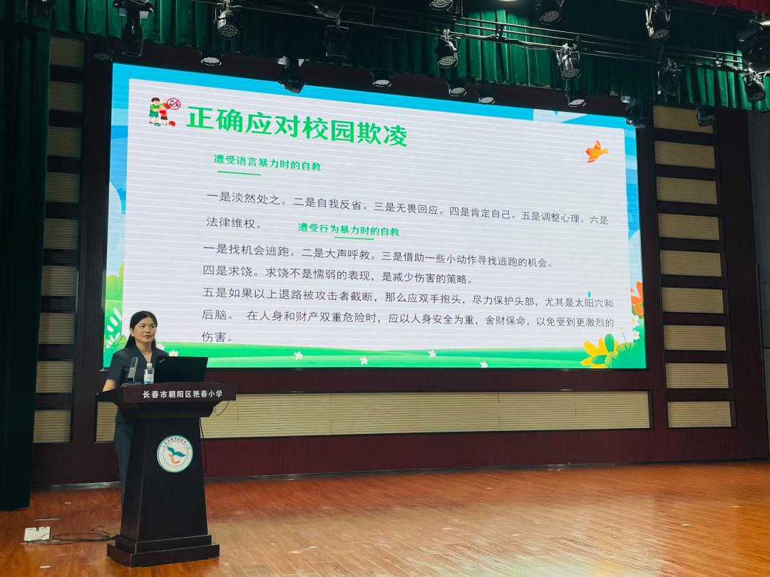 在艷春小學“法治第一課”上,長春市朝陽區人民法院執行局法官、法治副校長李東陽圍繞《中華人民共和國預防未成年人犯罪法》等相關法律法規,通過互動問答、播放宣傳短片等多種形式,用通俗易懂的語言向同學們講解了校園欺凌的定義、表現形式、危害影響、應對策略。法官著重強調了“雙向溝通”的重要性:未成年人產生不良行為或受到不良行為的侵害,往往同時存在著與家長、老師之間溝通不暢的問題,未成年人如果遇到自己解決不了的困境,要勇于開口述說自己遭受的困境、受到的傷害,要記得身后還站著家人、老師、社區、政府等各種可以提供支持的力量,能夠及時進行溝通是解決困難的有效方式。