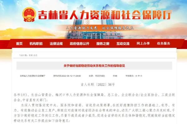 5月12日,吉林省人力資源和社會保障廳網站發布《關于做好當前穩定勞動關系有關工作的指導意見》(點擊查看意見全文)