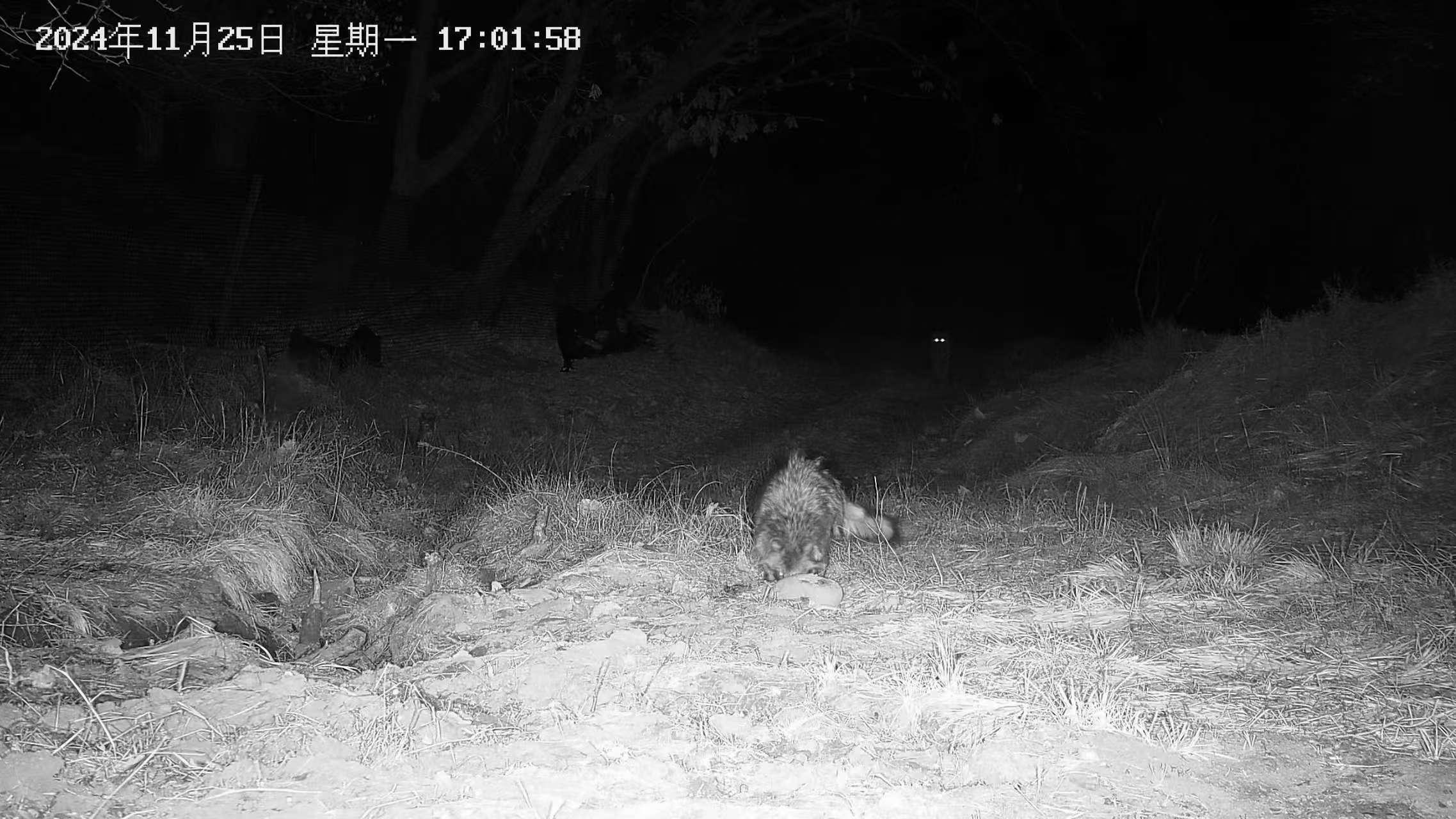 谷寶臣說:按照常理,老虎的嗅覺相當(dāng)靈敏,它和這只貉隔著不到兩米,即使看不到它也應(yīng)該能聞到它,但老虎根本沒搭理它,難道老虎只是巡視領(lǐng)地,根本沒有捕食的任務(wù)?自然界太多 無獨(dú)有偶,11月25日17點(diǎn),就在同一位置,同一只虎和同一只貉又一同出現(xiàn)在鏡頭中。照片里,胖貉正在美美的進(jìn)食,后面不遠(yuǎn)處一對手電筒一樣的大眼睛也出現(xiàn)在畫面里,放大觀看,那是一只東北虎,看樣子它好像也看到了貉。 谷寶臣說:虎豹公園里野生動物以肉眼可見的速度在增多,但它們好像都有自己的規(guī)矩,都有自己的生存智慧。虎貉兩次同框都相安無事,它們兩個到底是怎么樣的一種共生關(guān)系?真的挺值得研究。 初審:張立蘊(yùn) 復(fù)審:石巍 終審:曹夢南 |