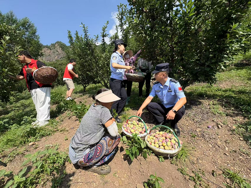 另一邊,身穿藍(lán)色警服的民警們穿梭在桃李園中,協(xié)助果農(nóng)采摘、分揀、搬運(yùn)、裝箱。